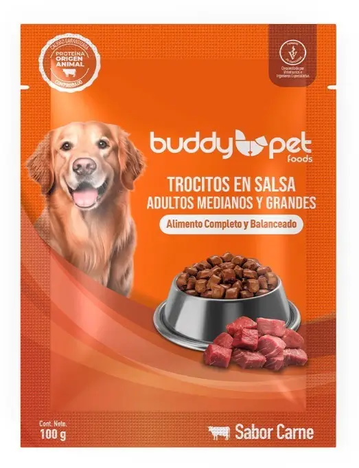 Buddy Pet ha creado esta deliciosa y nutritiva opción de Trocitos en Salsa Sabor Pollo. Un alimento húmedo completo y balanceado, donde cada porción está cuidadosamente elaborada con proteína de origen animal de primera calidad, asegurando una fuente óptima de energía y vitalidad para tu fiel amigo. Además, nuestra fórmula balanceada garantiza todos los nutrientes esenciales que tu mascota necesita para mantenerse saludable y feliz.